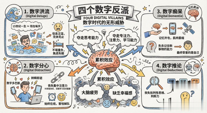 这个概念听起来可能有些危言耸听,但它揭示了一个我们不愿面对的真相。在书中,吉姆·奎克提出了四个阻碍我们大脑发挥潜能的“数字反派”:数字洪流(digital deluge)、是数字分心(digital distraction)、数字推论(digital deduction),以及最令人警醒的——数字痴呆 (digital dementia)。